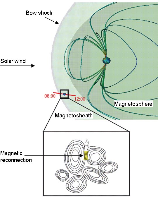 Depicts: Illustration of Cluster observations and location of magnetic reconnection event in the magnetosheath