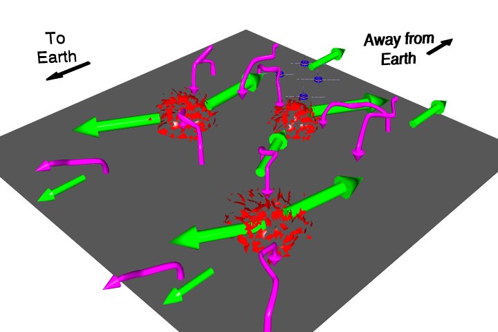The magnetic field lines are shown in purple, the plasma flow vectors are in green, and the current disruption sites are in red. The four Cluster spacecraft are depicted in blue.