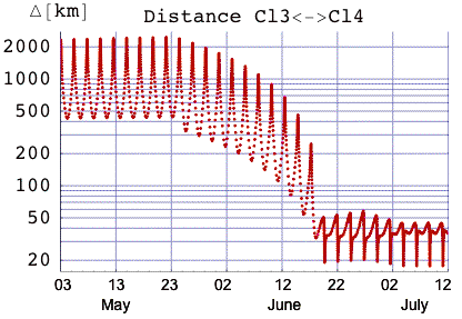 The two Cluster satellites Samba and Tango were manoeuvred to achieve a minimum separation distance of only 17 kilometres - the smallest separation distance ever achieved for two ESA satellites. Starting 21 June 2007, during their collective Earth orbit the two spacecraft will reach this smallest separation distance when they are close to perigee.