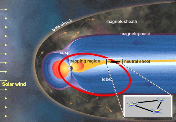 Orbit of the Cluster spacefleet in June 2007 within the Earth's magnetosphere. The inter-spacecraft distance at the neutral sheet is 40 km between Samba and Tango. This satellite pair is separated by a distance of 10 000 km with each of the two remaining spacecraft, Rumba and Salsa.