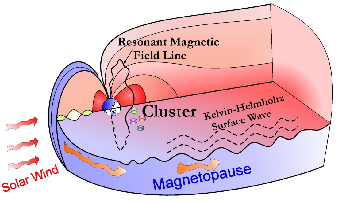 Artistic view of the incluence of the solar wind on the magnetosphere to create Kelvin-Helmholtz surface waves along the magnetopause and induce magnetic field line resonance, with the Cluster satellite constellation flying across.