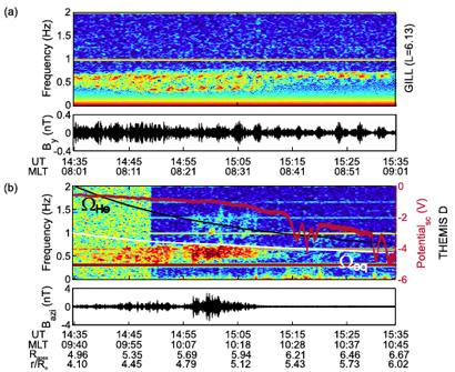 (a) Spectrogram (top) and time series (bottom) of the Y-component (geographic east-west) of magnetic field at Gillam (CARISMA station); (b) Spectral density (top) and waveform (bottom) of the perpendicular (azimuthal) magnetic field component in field-aligned coordinates recorded by THEMIS-D. Over-plotted are the spin-plane spacecraft potential (red line), the local (black line) and the equatorial (white line) helium gyrofrequency.