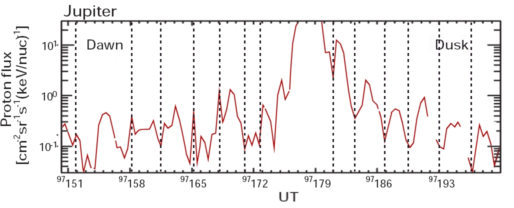 Energetic protons (220 - 540 keV/nuc) observed by Galileo on orbits G8 and C9 in the Jovian magnetotail from DOY 150 to DOY 200 in 1997. The vertical lines denote the times when substorms occur.