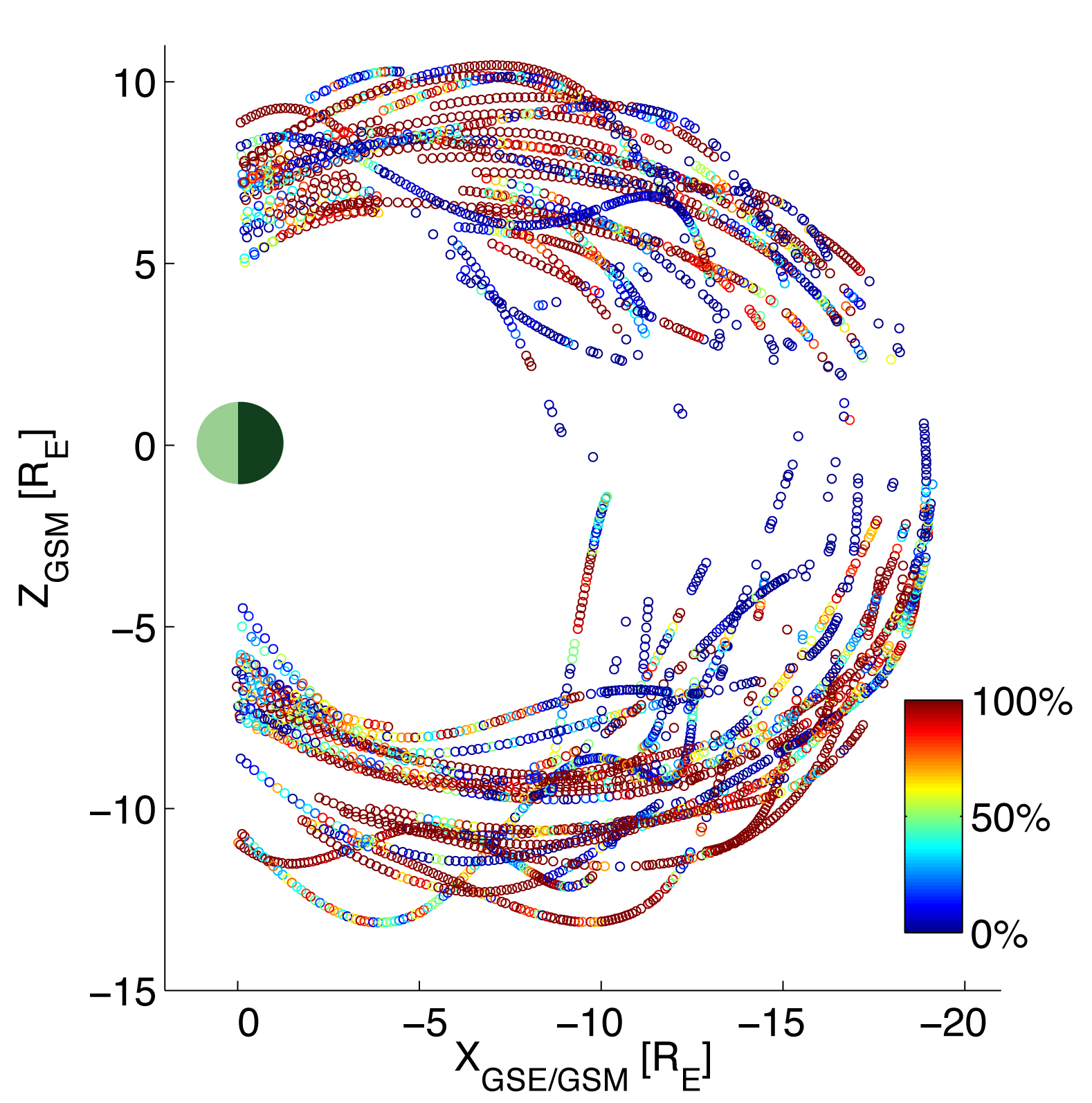 The figure above shows parts of Cluster orbits with geocentric distances over 5 RE from the Earth, for which the method of Engwall et al., (2009) was used to detect cold ions. Each point in the graph corresponds to 10 minutes of data. The colour shows the relative occurrence of cold ions. The data are from Cluster number 3 between July and October 2002.