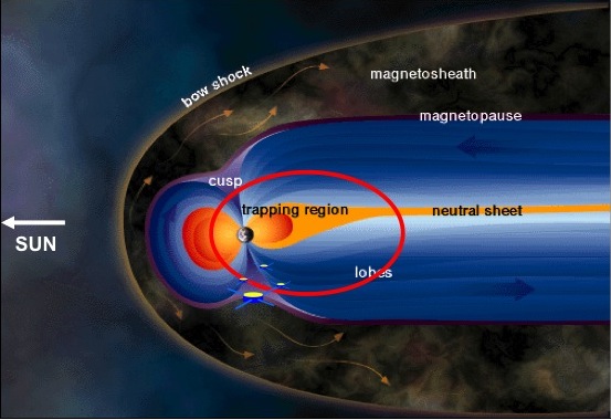 Illustration of Earth's magnetosphere (in blue) immersed in the solar wind. The orbit of the Cluster satellites is depicted in red. Earth's cusps are located near the poles. They are magnetic field features of the magnetosphere associated with regions through which plasma from the Sun can have direct access to the upper atmosphere.