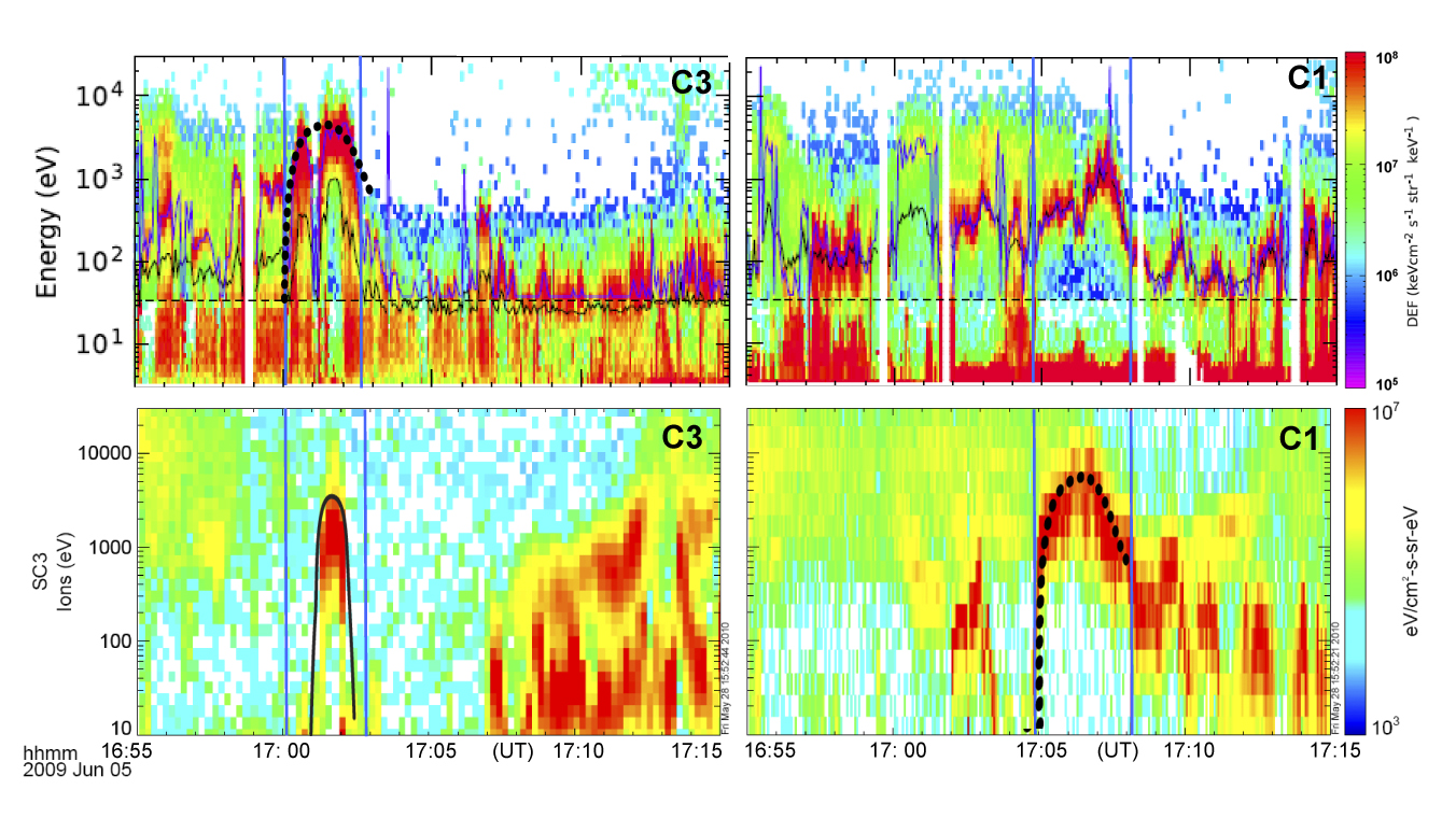 The top panels show the number of electrons moving down Earth's magnetic field lines toward the atmosphere. The lower panels show energy spectrograms of ions going up the field lines. At top left, there are two regions with enhanced flux of descending electrons with peak energies of 4 and 5 keV. At top right, there are similar peaks associated with downward moving electrons at energies of 0.4 keV and 1 keV (dark red). The observed widths and peak energies of the ascending ions observed by C1 match those of the descending electrons observed by Cluster 3, as illustrated by the dotted curves, demonstrating that the acceleration region was located between the spcaecraft.