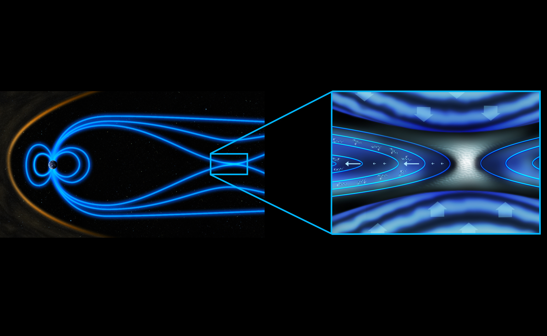 This illustration shows the configuration of a region, in the tail of Earth's magnetosphere, where magnetic reconnection is taking place. Two flows of plasma with anti-parallel magnetic fields are pushed together, flowing in from above and below. This creates a thin current sheet. As plasma continues to flow towards this sheet, particles are accelerated and eventually released via two symmetric jets: one towards Earth (to the left in the image) and another in the opposite direction.
