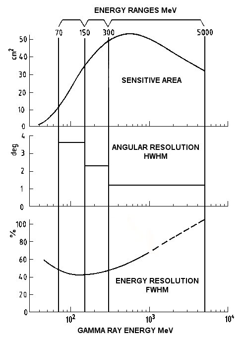 The plot shows (from top to bottom) the effective sensitive area, the angular resolution and the energy resolution of Cos-B as a function of the gamma ray energy.
