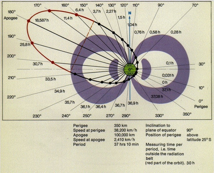 The measuring time where Cos-B was outside the radiation belts (30 hours per orbital period), is indicated with the red section of the orbit.