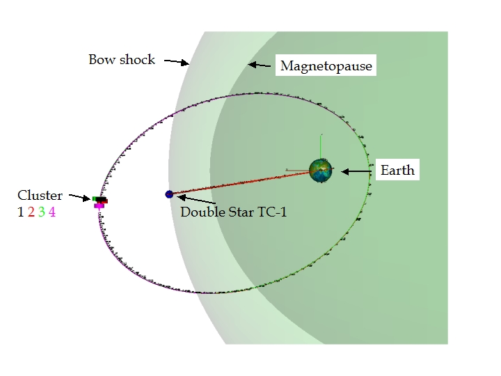 Double Star and Cluster complementary orbits. The four Cluster spacecraft are in the solar wind and Double Star is crossing the bow shock at the same time.