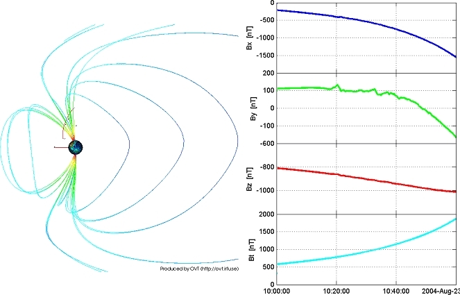 Magnetic field observations during a cusp encounter on 23 August 2004, 10:20-10:50 UT. The left-hand figure shows TC-2 orbit across the northern cusp funnel; the Sun is to the left. The right-hand figure shows the three magnetic field components in the GSE coordinate system and the total field at bottom. The measurements are dominated by the Earth's magnetic field but during the cusp encounter one can see variations in the By component which are caused by strong electric currents existing in the cusp.