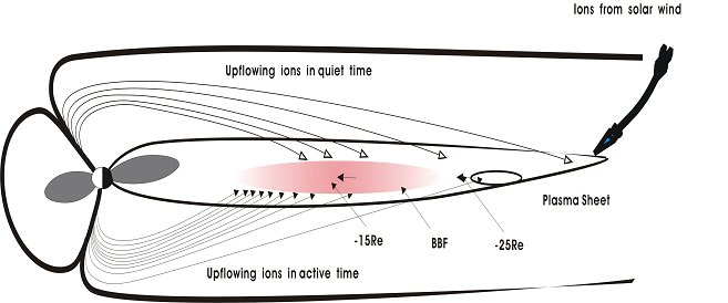 Sketch of upflowing terrestrial ions populating the magnetosphere. The thin lines show the trajectory of the ions. For simplicity the ions observed during quiet periods are shown in the Northern hemisphere and those observed during active periods are shown in the Southern hemisphere; in reality they are all observed in both hemispheres.
