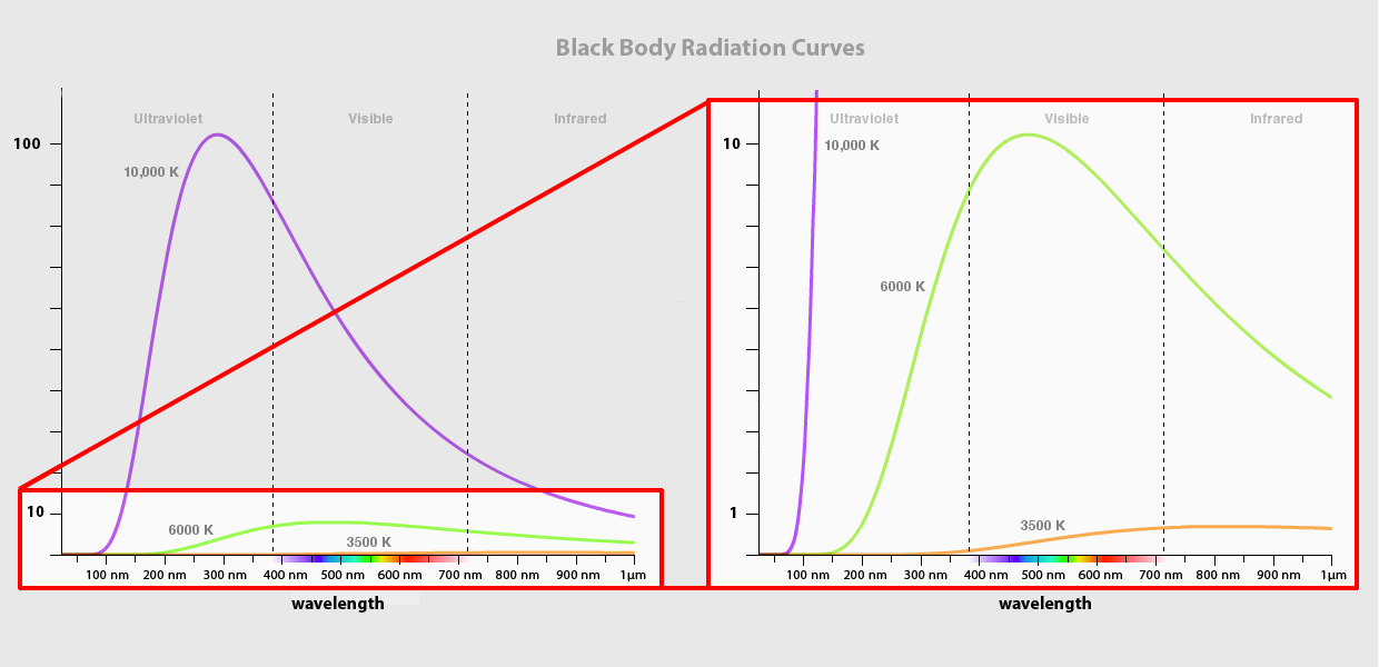 The panel on the right shows a close-up of the inset enclosed in the red frame: hotter objects emit more radiation than colder objects over all wavelengths, but the shape of the curve remains the same.