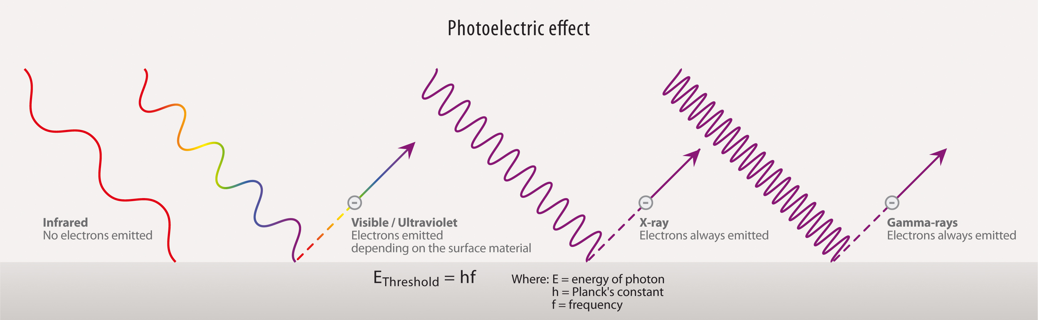 Light rays striking a surface will be absorbed if their energy is higher than a certain threshold value, which depends on the surface material. The energy of the absorbed light is transferred to electrons in the material, which are then emitted. This phenomenon, known as the photoelectric effect, generally occurs with highly energetic radiation such as ultraviolet light, X- and gamma rays. For a dramatic way to teach the subject at school, see Bernardelli (2010).