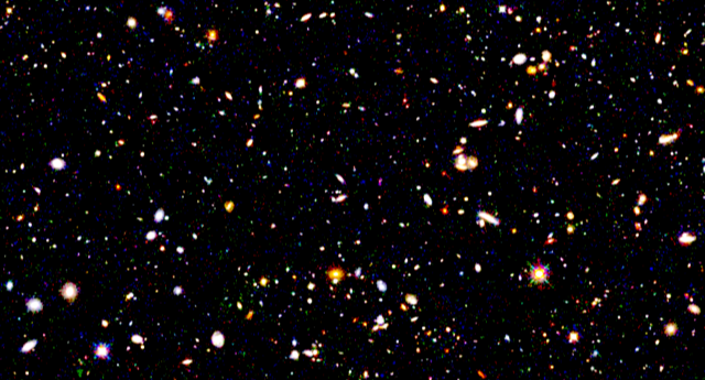 The three Euclid Deep Fields provide a window to examine large amounts of galaxies, looking back to the epoch when the first stars and galaxies formed, which occurred in the first billion year of the Universe's history. The small, red galaxies in this view indicate some of the most distant galaxies that the survey will reveal.