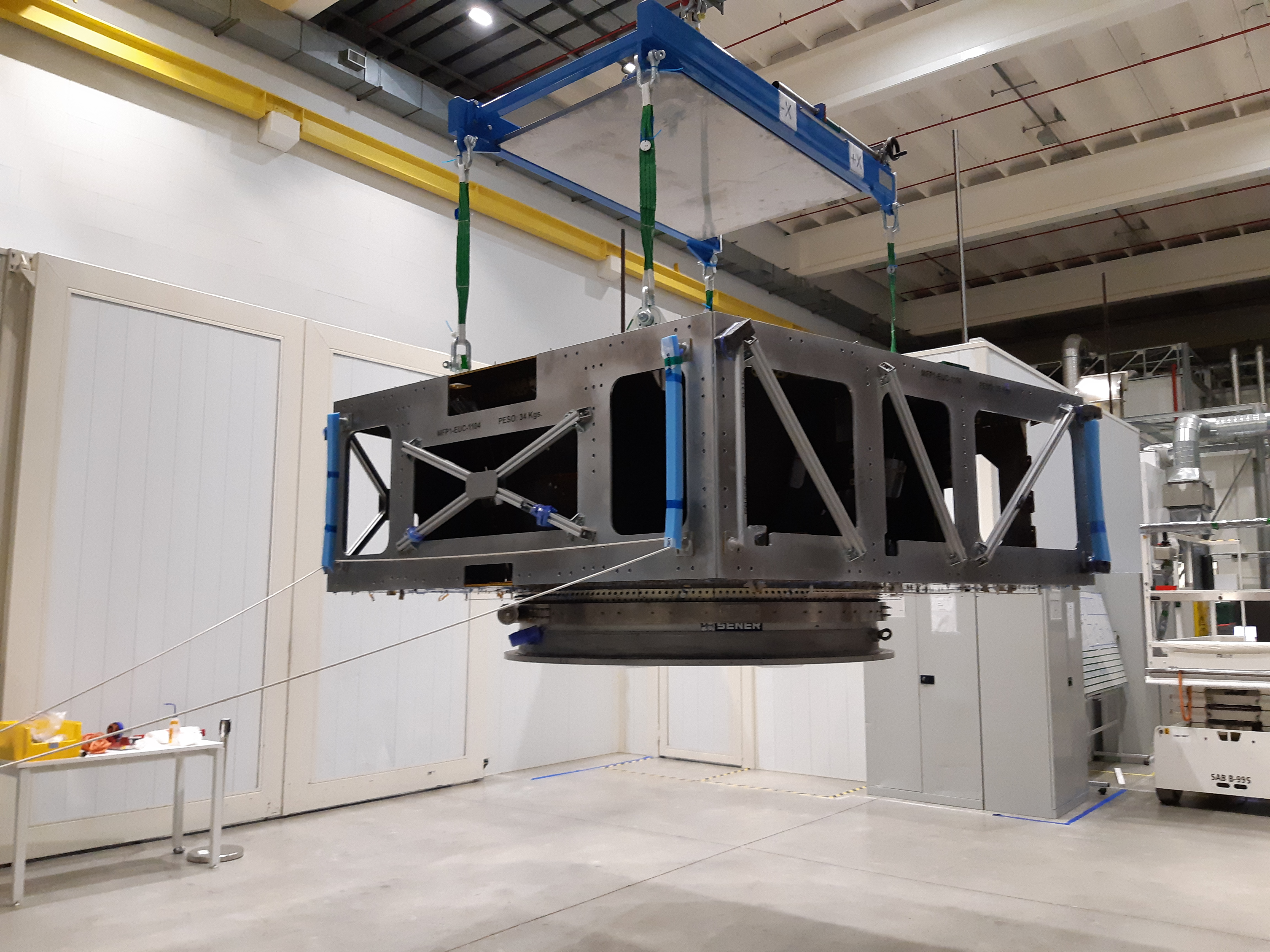 The flight model of ESA's Euclid mission's service module being moved in the clean room at Thales Alenia Space in Torino, Italy.