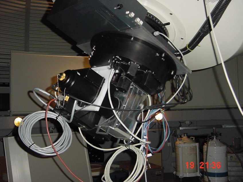 Mounting of filter wheel and camera to the Ritchey-Chretien focus of the telescope. The obvious cylinder at the center of the image is the liquid nitrogen dewar of the the camera.
