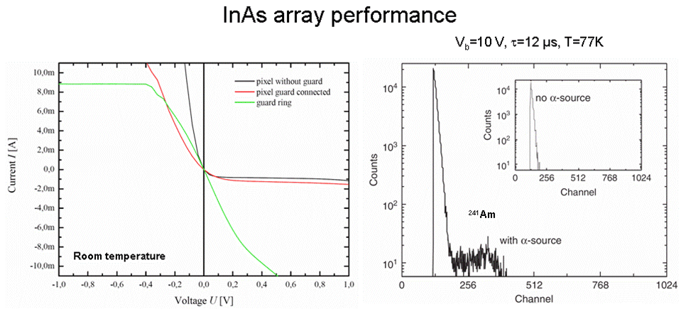 Right: | Comparing the pixel's spectral response with and without exposure to an alpha source (241AM) |