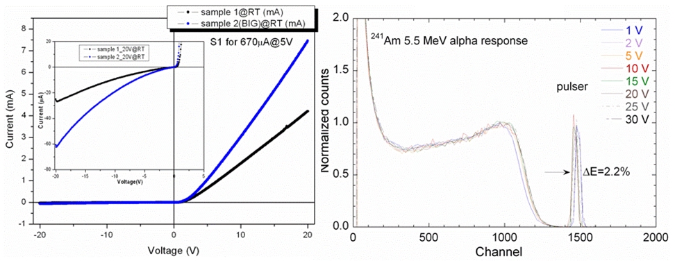 Right: response to an Alpha response as a function of bias. For comparison, without the source, there are no events above channel 200.