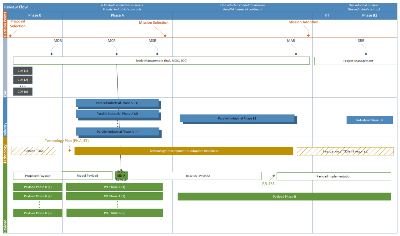 This figure indicates the phases and project lifecycle of missions in ESA's Science Programme, from Phase 0 through to mission adoption.