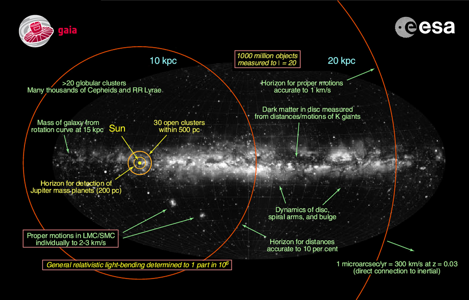 Depicts: Illustration of Gaia's range and expected contribution to our knowledge of the Galaxy