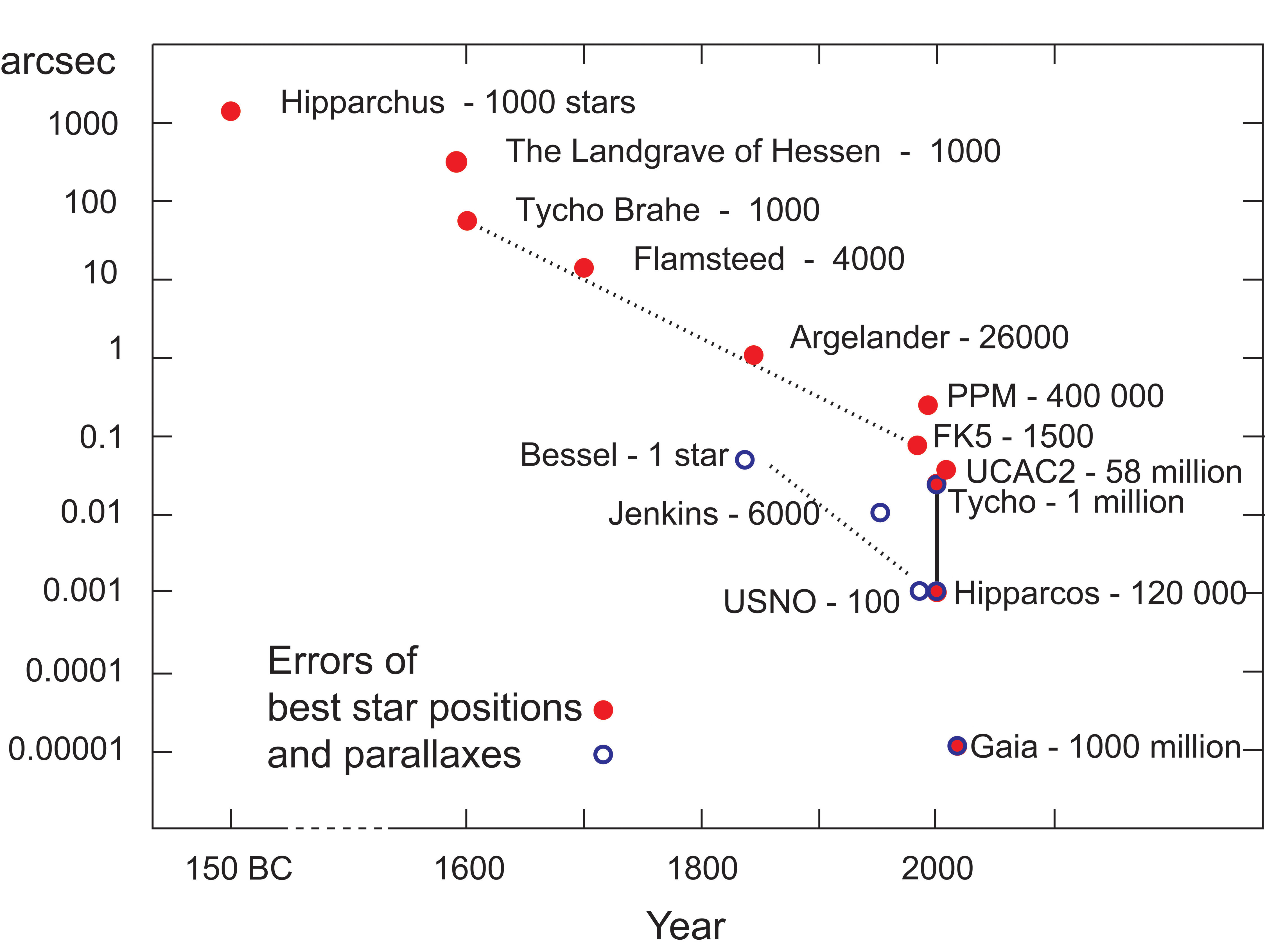 Between the Hipparchus and Hipparcos catalogues two periods of dramatic increase in astrometric accuracy can be identified. In the early 17th Century Tycho Brahe achieved the first significant breakthrough in astronomical accuracy. Almost four hundred years later, Hipparcos, the first space astrometry mission, achieved the next significant improvement in astrometric accuracies. ESA's Gaia mission pushes space-based astrometric measurements to the limits. The Gaia catalogue is expected to be available 3 years after the Gaia mission is completed.