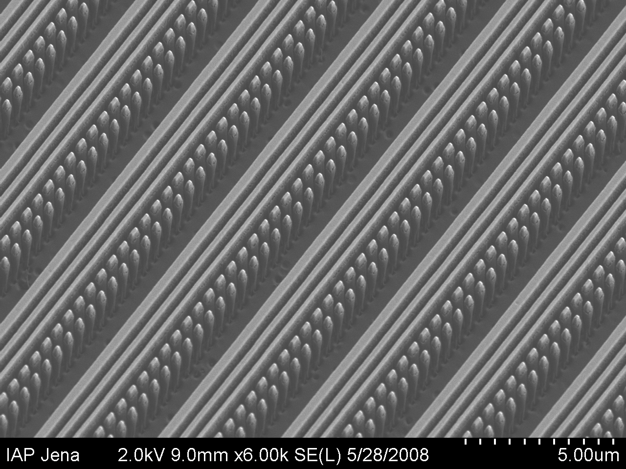 The blazed transmission grating has 302.11 grooves per mm. The grooves are clearly visible in this electron microscope image of the grating's surface texture, running parallel from lower left to upper right. Each groove element (unit cell) actually comprises 5 patches of binary index modulation elements over a width of 3.31 µm. The elements that make up a single groove can be seen clearly in this image as the repeated pattern of discrete patches (3 patches run continuously along the groove and two patches are discontinuous along the groove).
