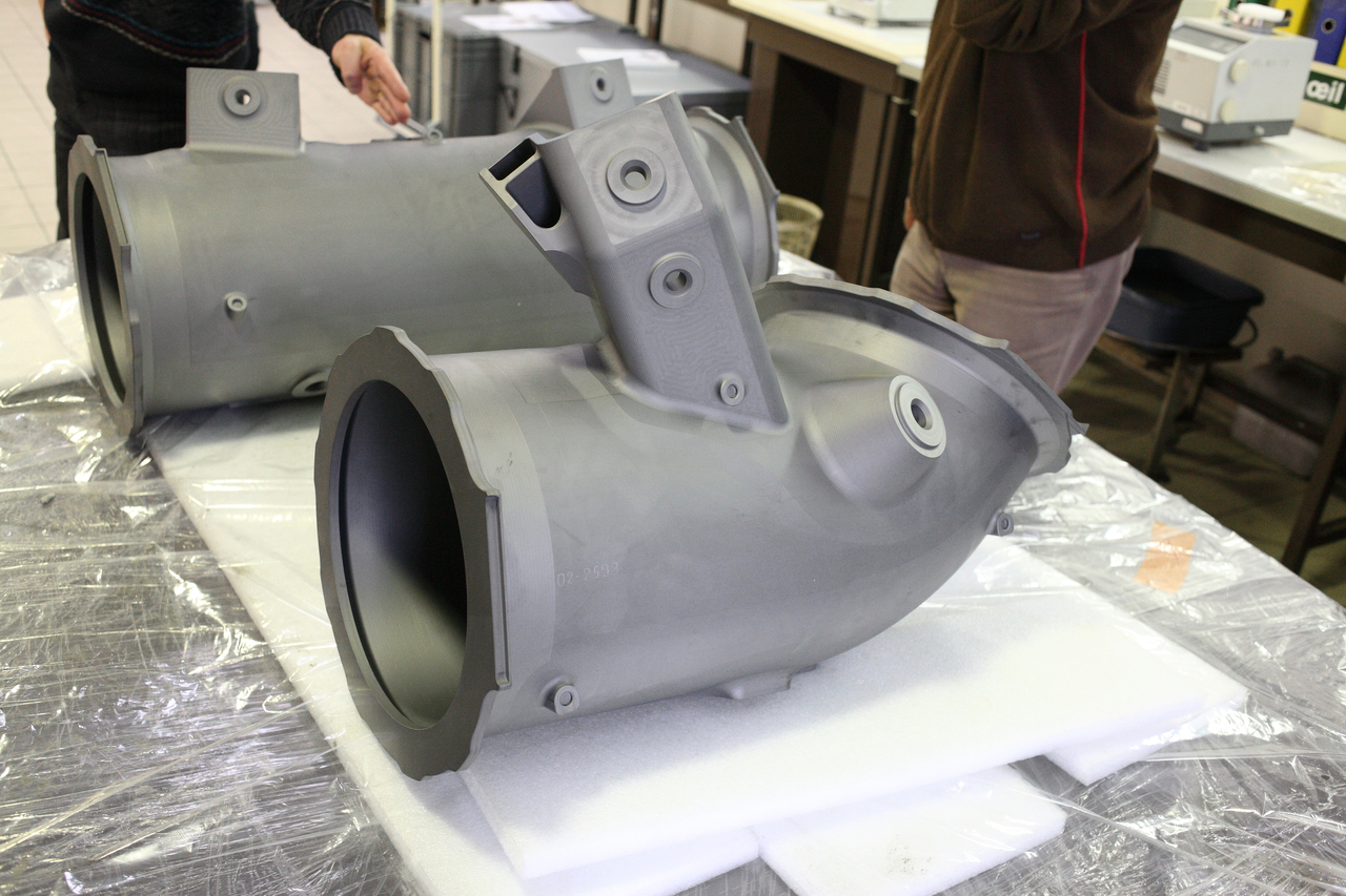 The Gaia torus is composed of 17 individual custom-built Silicon Carbide segments. Each segment features reference points and boreholes to facilitate quality control. These are clearly visible in the two segments shown in this photograph.