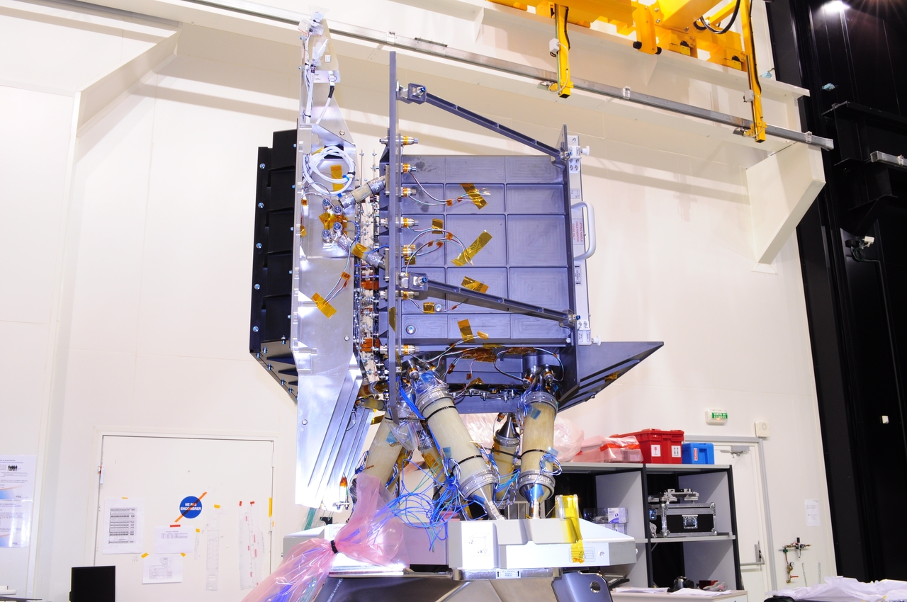 This photograph shows a side view of the Gaia focal plane assembly (FPA) structural model (SM) in the cleanroom at INTESPACE, Toulouse, France.