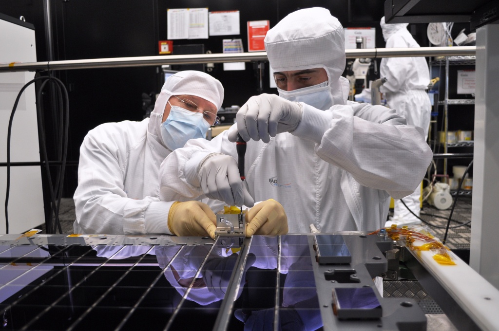 A total of 106 CCDs make up Gaia's focal plane. Technicians from Astrium France, the Gaia mission's prime contractor, are seen here carefully bolting and aligning the CCDs onto the CCD support structure (CSS), at the company's facility in Toulouse.