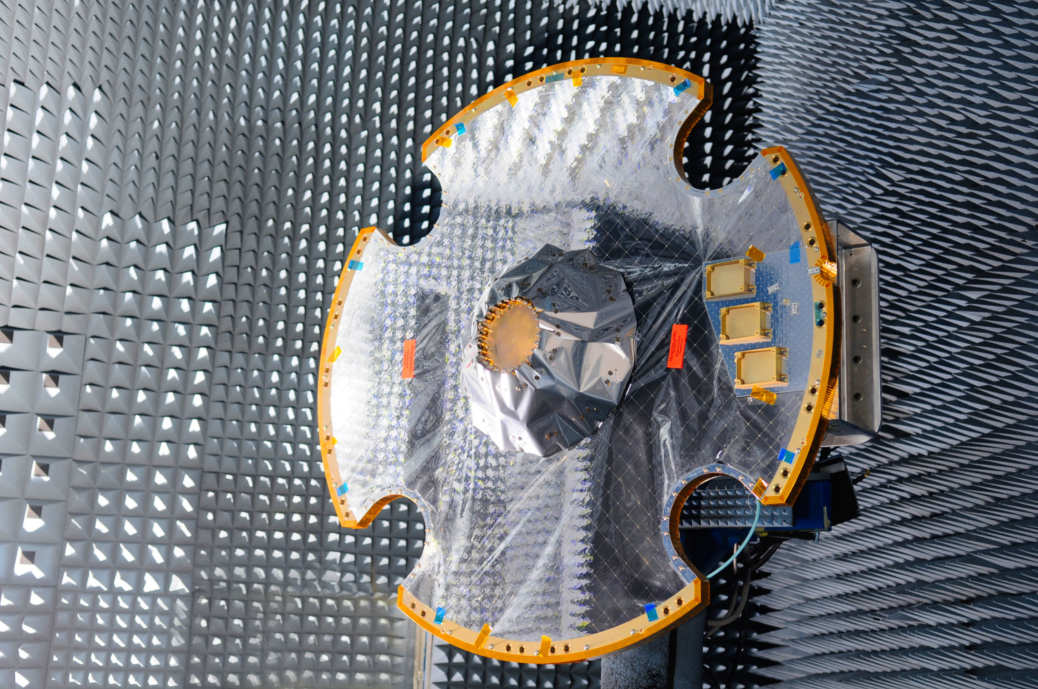 The 1.5m wide Gaia Antenna Panel, which contains the satellite's Phased Array Antenna, is seen here inside the Antenna Test Facility at EADS CASA test facility in Madrid.