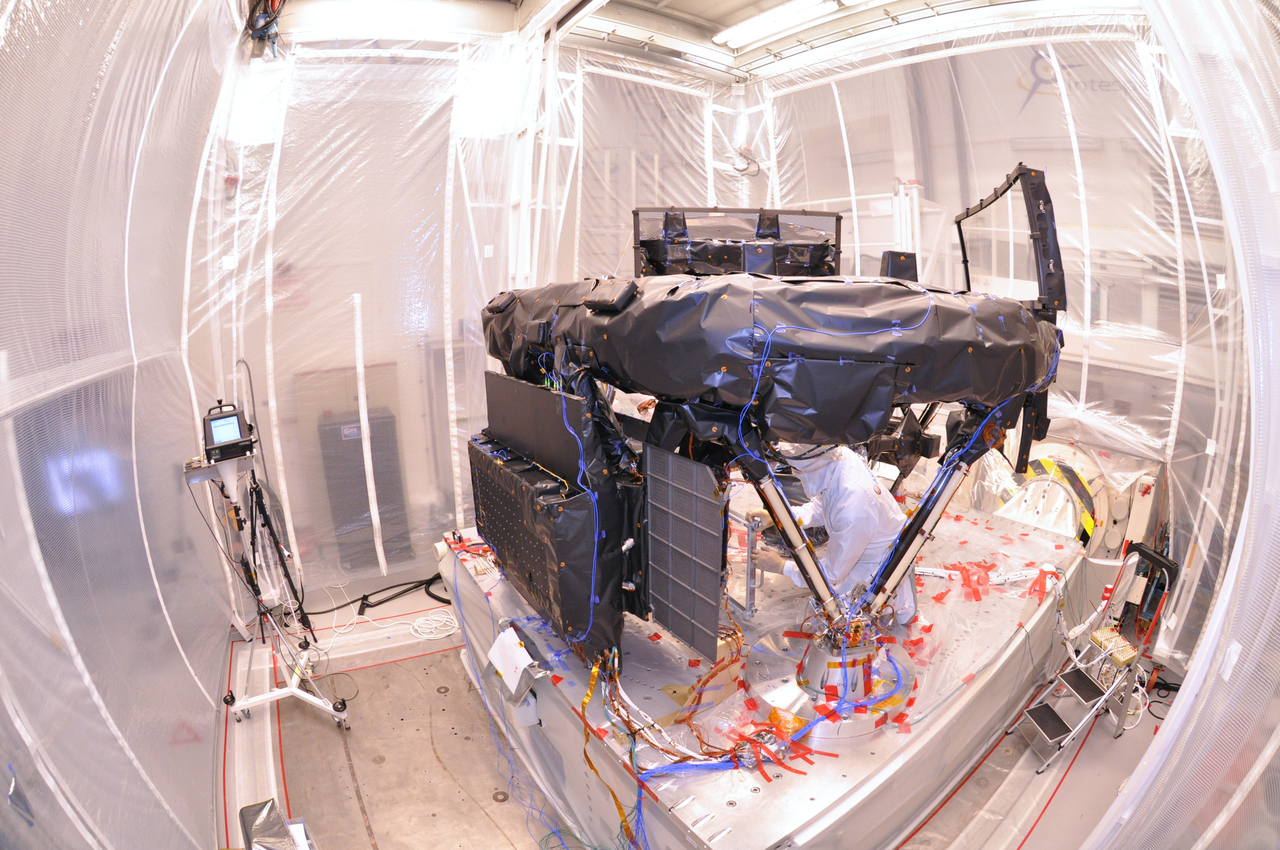 The PLM is surrounded by a plastic tent to prevent contamination. An Astrium test engineer is shown removing protective covering from the focal plane assembly prior to the vibration tests.