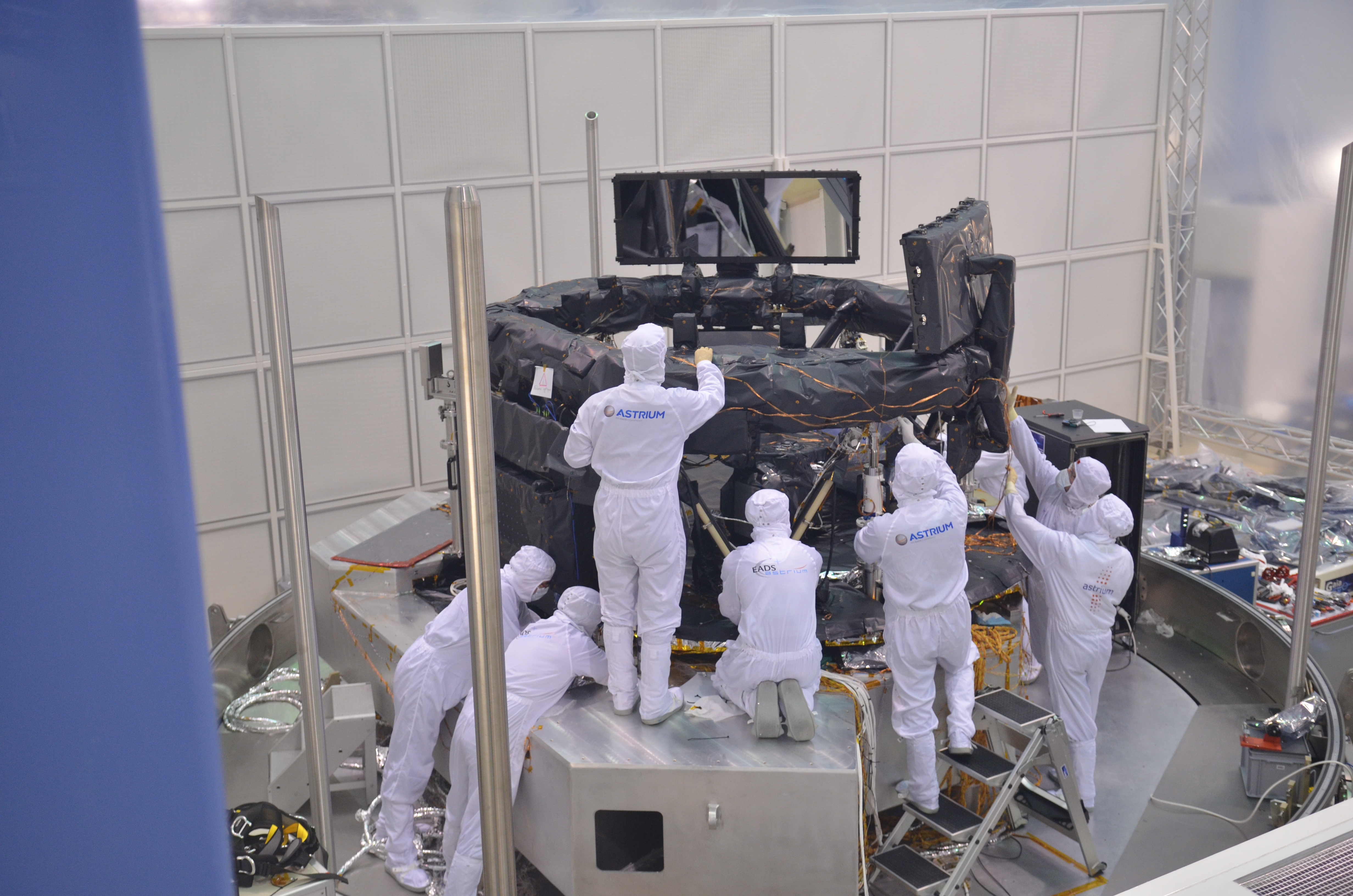 Now that the lifting equipment has been removed, the clean tent that surrounds the preparation area has been closed. With this protection against contamination of the optical components in place, the individual covers on the mirrors and focal plane array have been removed.