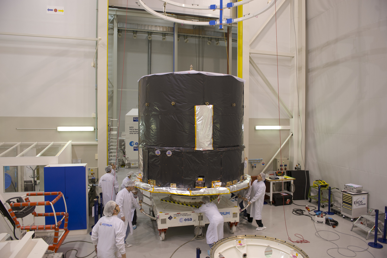 The Gaia Flight Model spacecraft on its integration trolley at the end of the mass properties measurement campaign at the facilities of Intespace in Toulouse, France.