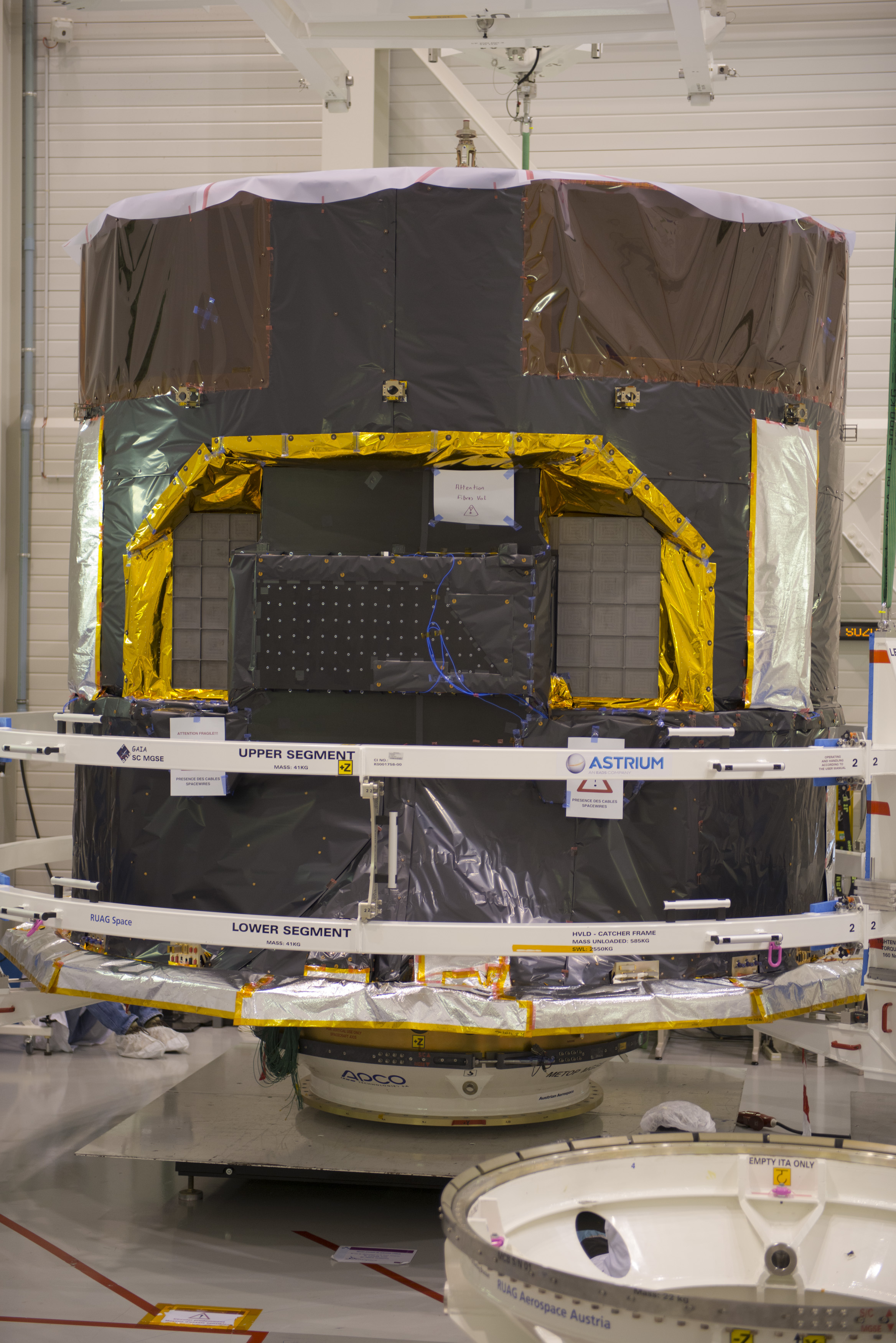 The Gaia Flight Model spacecraft on the scale for total mass measurement during the mass properties measurement campaign at the facilities of Intespace in Toulouse, France.