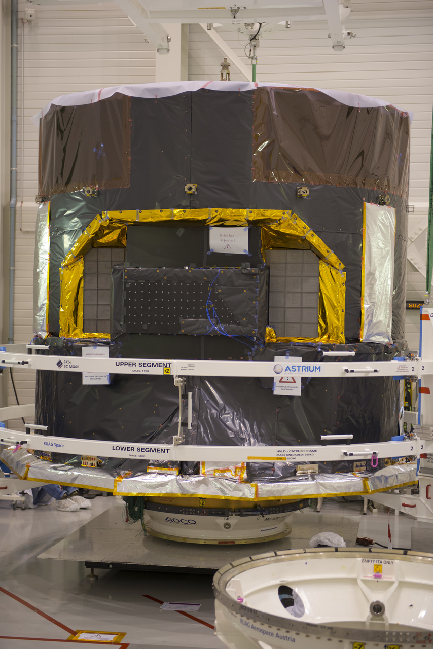 The interface for the equipment used to measure the position of the spacecraft centre of gravity on Y- and Z-axes (both horizontal in this configuration) can be seen in the foreground.