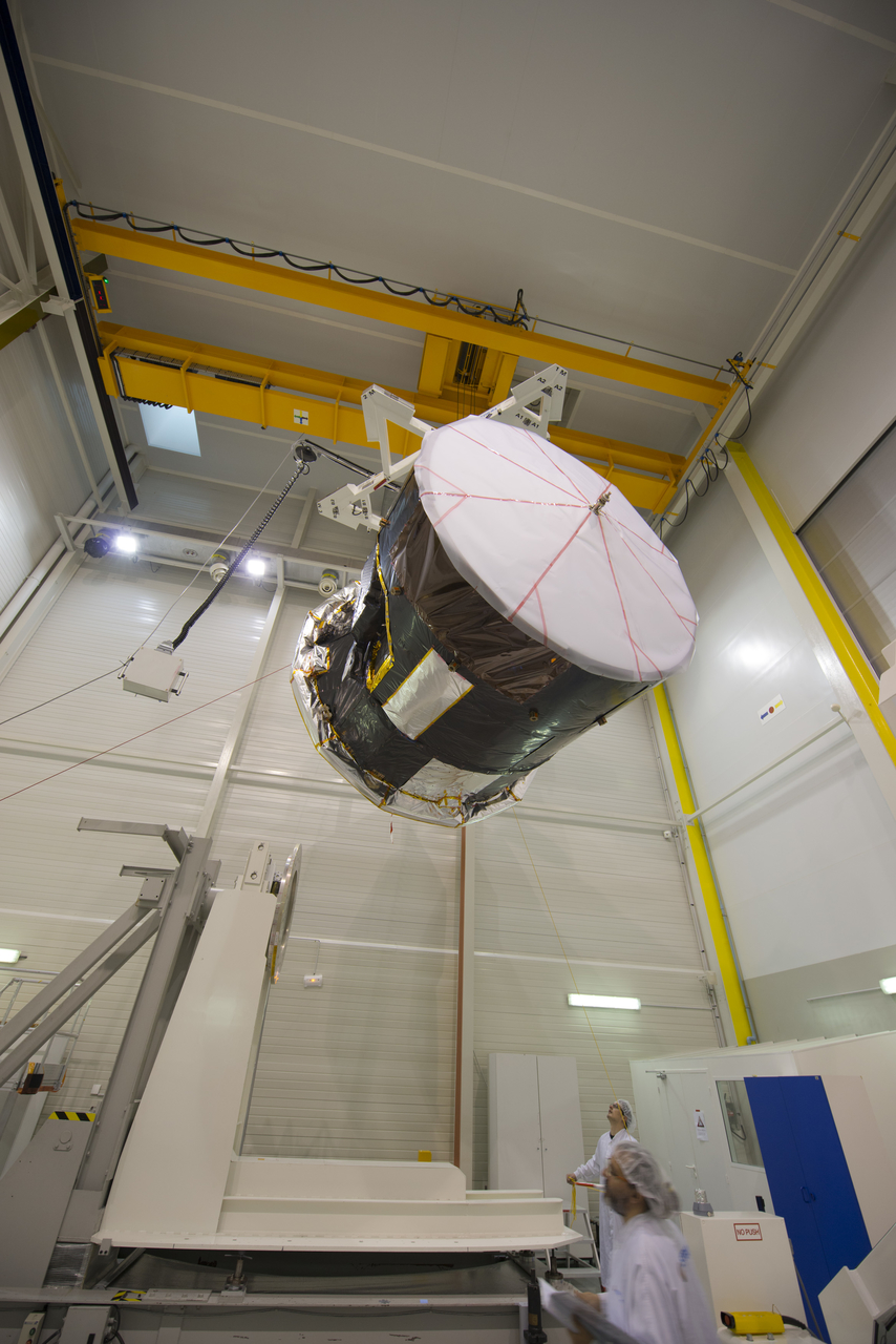 The Gaia Flight Model spacecraft being lifted by an overhead crane for installation on one of the mass properties measurement systems (lower left) at the facilities of Intespace in Toulouse, France.