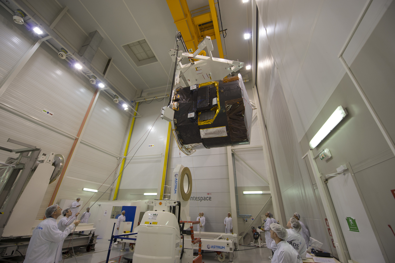 The Gaia Flight Model spacecraft being lifted from its ground handling trolley (background, centre) for installation on one of the mass properties measurement systems (extreme left) at the facilities of Intespace in Toulouse, France.
