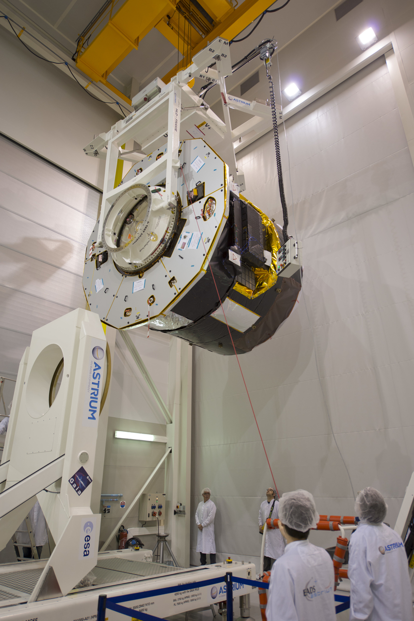 The Gaia Flight Model spacecraft being lifted from its ground handling trolley in preparation for installation on one of the mass properties measurement systems at the facilities of Intespace in Toulouse, France.