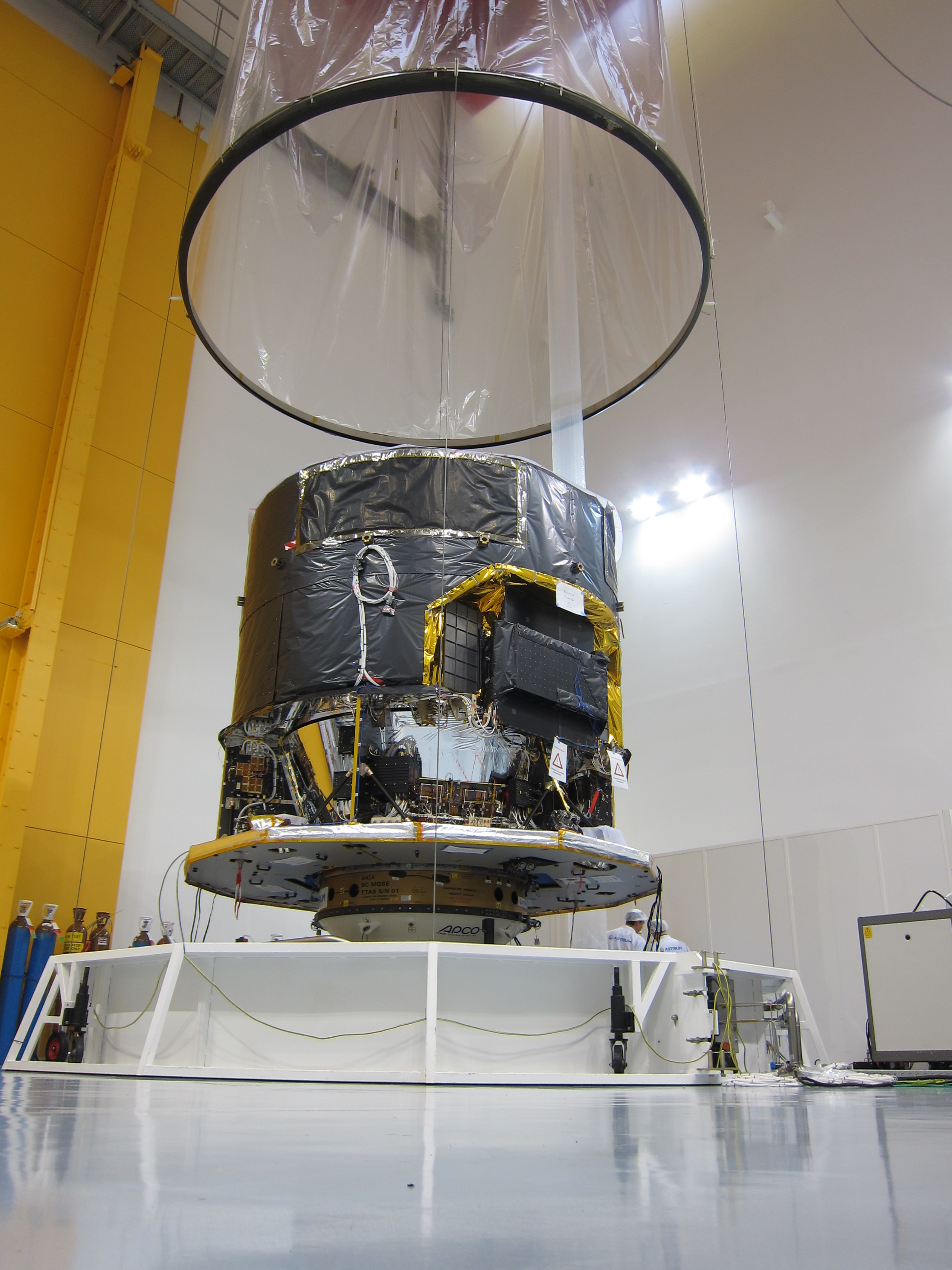 The Gaia Flight Model (FM) spacecraft being prepared for leak testing. The propellants used for Gaia's propulsion systems are both highly toxic and corrosive, so it is important both for the correct operation of the mission and for the safety of the ground processing personnel during fuelling and subsequent ground operations that there are no leaks in the systems. To verify this, the Gaia FM spacecraft was enclosed in a plastic envelope and the propulsion systems were pressurised with helium. A mass spectrometer was used to detect changes in the concentration of helium inside the envelope once pressurisation had occurred. Any rise above the baseline level of helium present in the atmosphere would have indicated a leak. No leaks were detected.