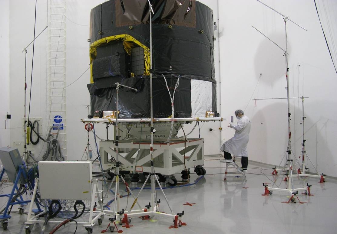 The Gaia Flight Model spacecraft being prepared for acoustic testing. Gaia was placed in the acoustic test chamber at the premises of Intespace in Toulouse, France, and subjected to a simulation of the acoustic environment it will experience during launch. The extreme acoustic levels during launch are due mainly to the noise of the launcher's engines, with a smaller contribution from the airflow over the fairing during the climb through Earth's atmosphere at supersonic speeds.