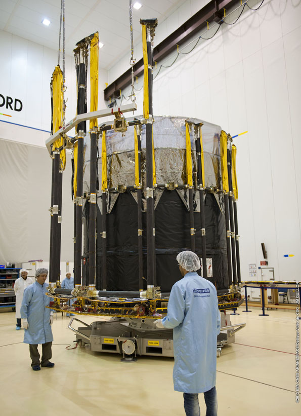 Engineers from SENER and Astrium install the Deployable Sunshield Assembly (DSA) onto Gaia in the S1B cleanroom at the Centre Spatial Guyanais in Kourou, French Guiana.