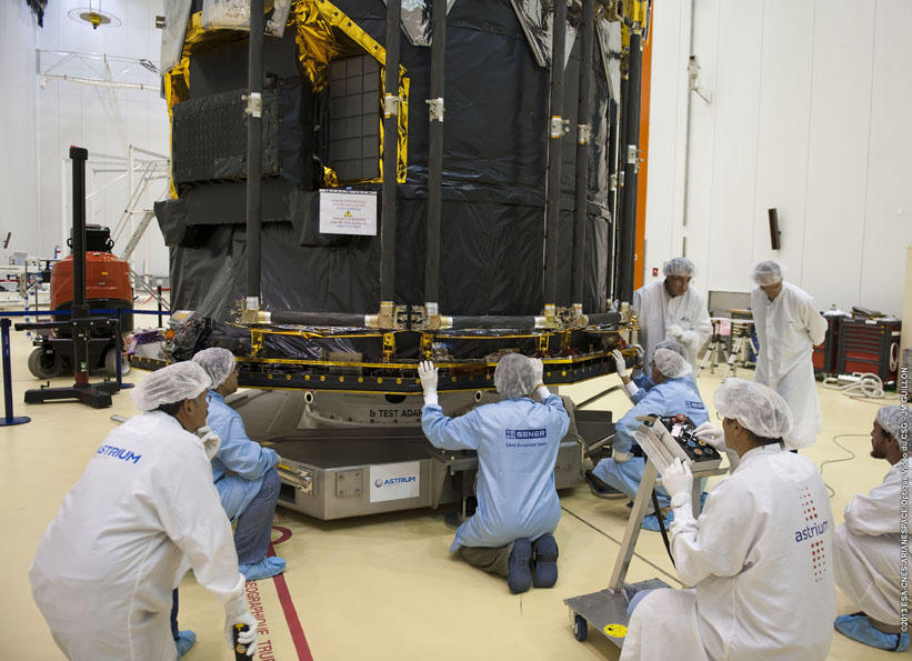 Engineers from SENER and Astrium install the Deployable Sunshield Assembly (DSA) onto Gaia in the S1B cleanroom at the Centre Spatial Guyanais in Kourou, French Guiana.