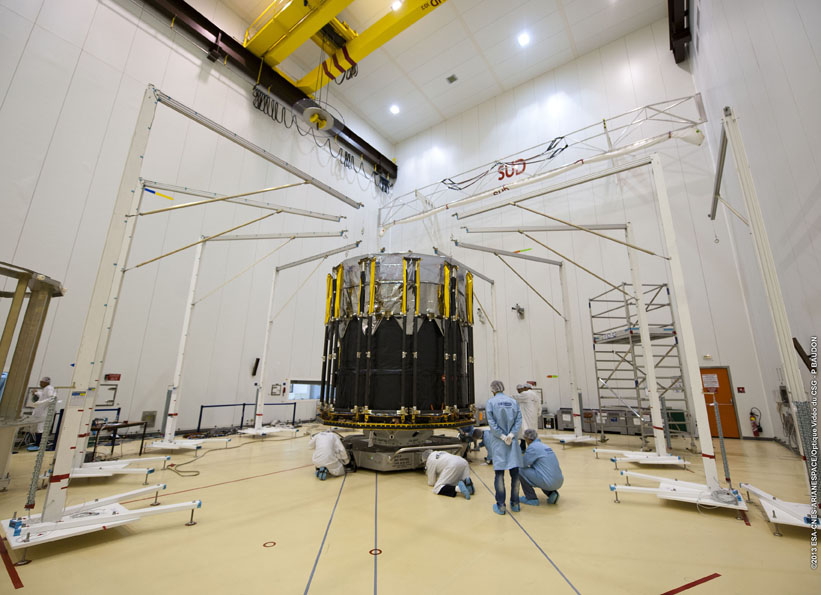 The Gaia spacecraft, with the framework of the Deployable Sunshield Assembly (DSA), in the S1B cleanroom at the Centre Spatial Guyanais in Kourou, French Guiana.