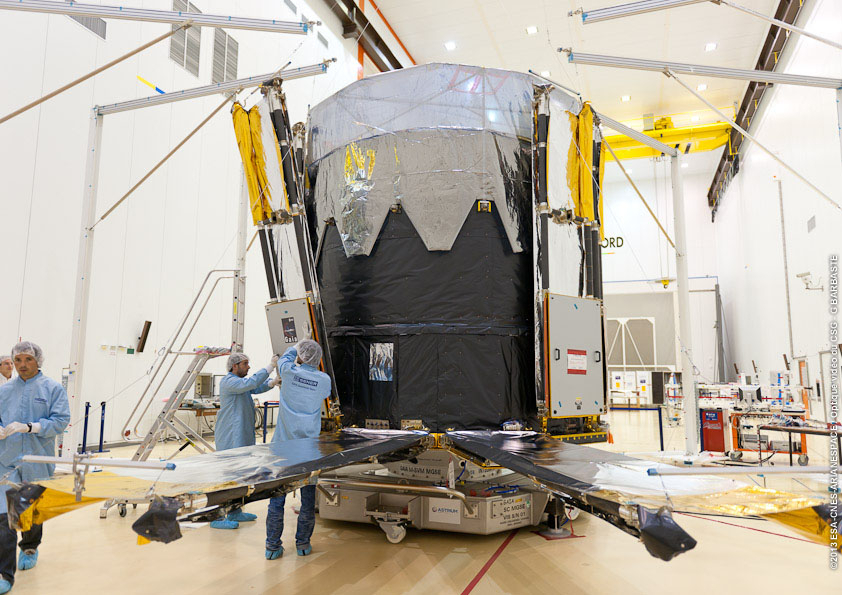 Prior to transport, the multi-layer insulation (MLI) of the DSA had been removed for inspection and storage. Once in Kourou, the DSA had to be 'reconstructed' by installing the MLI and solar panels (some seen here with protective covers in place) on the framework, and tested.