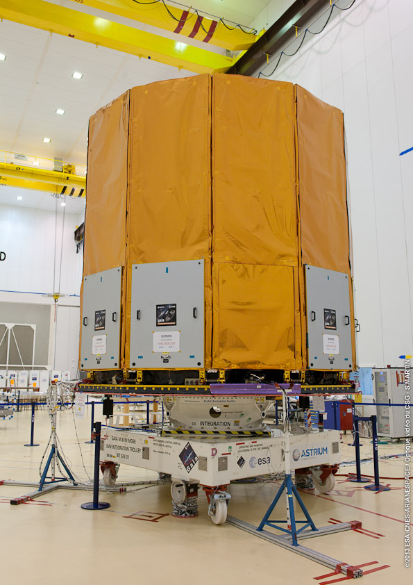 The Gaia spacecraft, with Deployable Sunshield Assembly (DSA) stowed in position, in the S1B cleanroom at the Centre Spatial Guyanais in Kourou, French Guiana.
