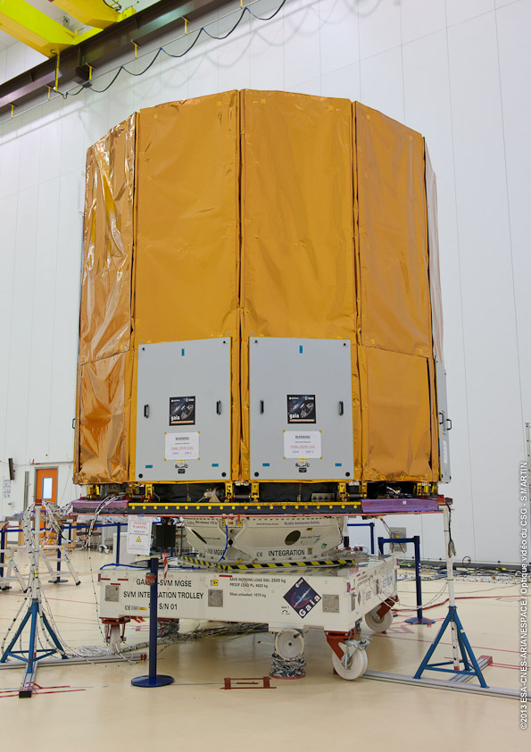The Gaia spacecraft, with Deployable Sunshield Assembly (DSA) stowed in position, in the S1B cleanroom at the Centre Spatial Guyanais in Kourou, French Guiana.