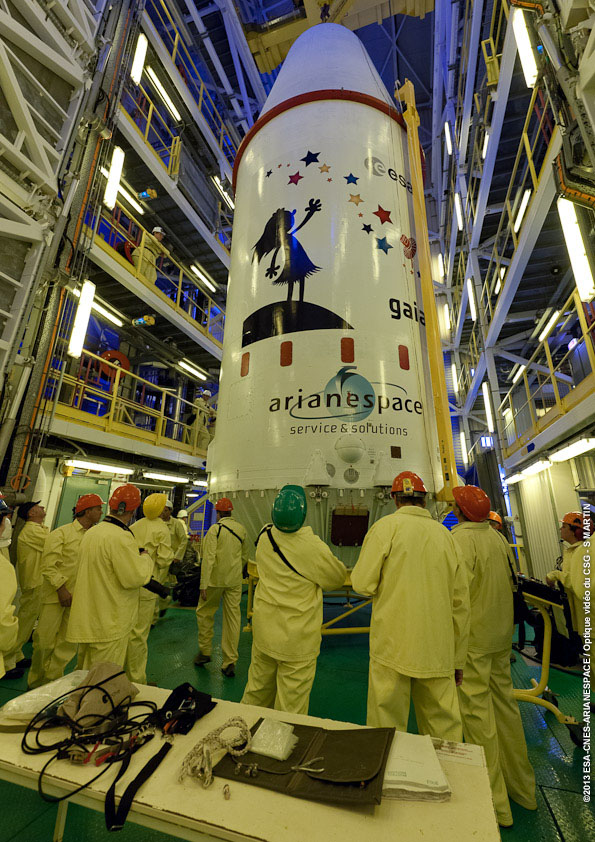 The Gaia spacecraft - mated with the Fregat stage and enclosed by the fairing - is ready to be placed on top of the Soyuz launcher, inside the mobile gantry on the launch pad. The Soyuz launcher is below the platform inside the 53-metre tall mobile gantry and is not visible in this photo.