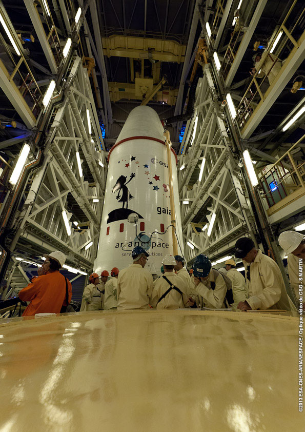 The Gaia spacecraft - mated with the Fregat stage and enclosed by the fairing - is lowered onto the Soyuz launcher, using an overhead crane inside the mobile gantry on the launch pad. The Soyuz launcher is below the platform inside the 53-metre tall mobile gantry and not visible in this photo.