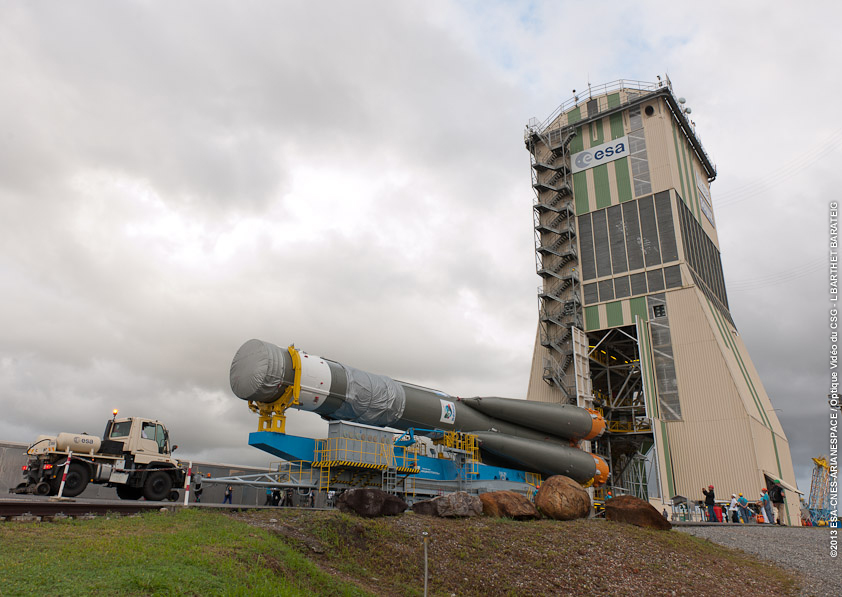 14 December 2013: The Gaia launch vehicle (VS06) arrives at the mobile gantry that protects the Soyuz launcher at the launch pad.